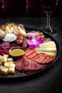 Selection of meats and cheeses with pickled vegetables, spicy mustard and toasted bread